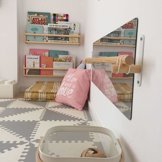 Javaslom, hogy a babaszobában a polcokat a kicsi szemmagasságában helyezzétek el. Tegyétek elérhetővé számára a rajtuk elhelyezett tárgyakat. Ha mesekönyvek borítója kifele néz, az 1-2 éves babóca már tud választani és azok visszahelyezése is könnyebb a számára. A legszükségesebb játékokat érdemes levegősen kitenni, törekedjük az egyszerűségre.