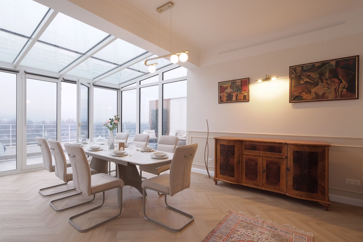 A lakásból a teraszról és az étkezőből a kilátás lenyűgőző. Reggeli kávéját az ide érkező egy üvegtetejű zárt teraszon fogyaszthatja el egy igazi travertinkő étkezőasztal mellett.