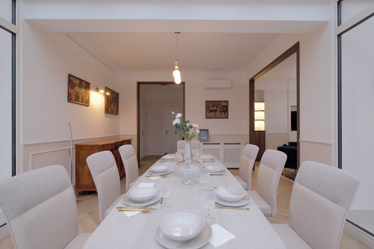 Budapesten a Margit-szigetre nyíló kilátással rendelkező luxusingatlan teljeskörű berendezését terveztem meg teljeskörűen. A cél az ingatlan kiadása volt, amellett, hogy a már meglévő, örökölt, értékes, századeleji bútorok a lakótérben maradhassanak, és emeljén annak hangulatát.