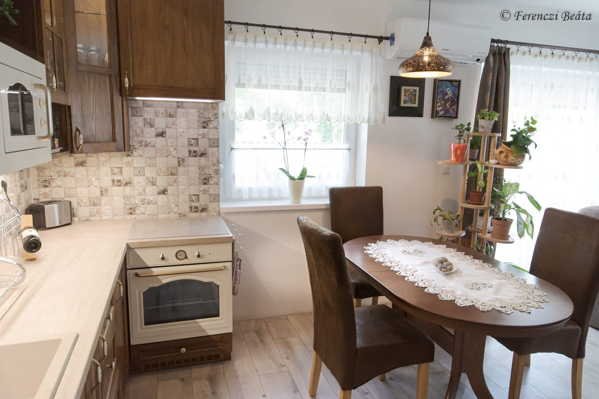Az alap elképzelést a tulajdonos hölgy kiváló ízlése adta. A konyhabútort valódi fából álmodta meg meleg barna színben, vintage, kissé rusztikus stílusban. Mind a konyha, mind az étkező bútorai minőségi anyagokból készültek: az egyedi konyhabútor, az étkező asztala és székei valódi tölgyfából készültek, az étkező székek bőrülésesek, a konyhabútorba minőségi gránit mosogató, indukciós főzőlap és elektromos sütő került beépítésre.