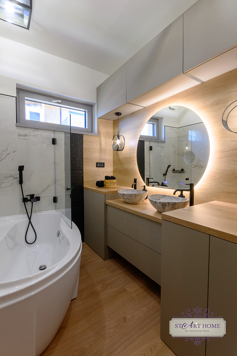 A fürdőszoba és toilette két kicsiny helyiség volt, ezért megtettem mindent, hogy a helykihasználás a legpraktikusabb legyen, a szükséges gépek szépen és praktikusan elférjenek, miközben az esztétikum igazi élményt nyújtson. A különleges ledes megvilágítások, ledes tükör, egyedi mennyezeti lámpák és függesztékek, az ez esetben is egyedileg tervezett és kivitelezett fürdőszobabútor tökéletes összhangot alkot és kiváló lehetőséget biztosít az ottlakók számára, hogy pihenhessenek ebben a helyiségben.