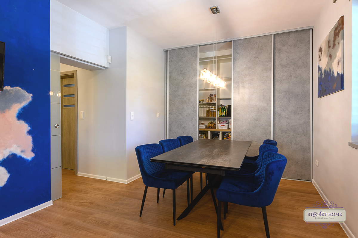 Az egy légterű régi konyhát és étkezőt is újragondoltunk. A két funkció elhelyezkedését a térben felcseréltük és funkcionálisan teljesen az ügyfelem és családja igényire, mindennapjaira szabott helyiséget hoztunk létre.