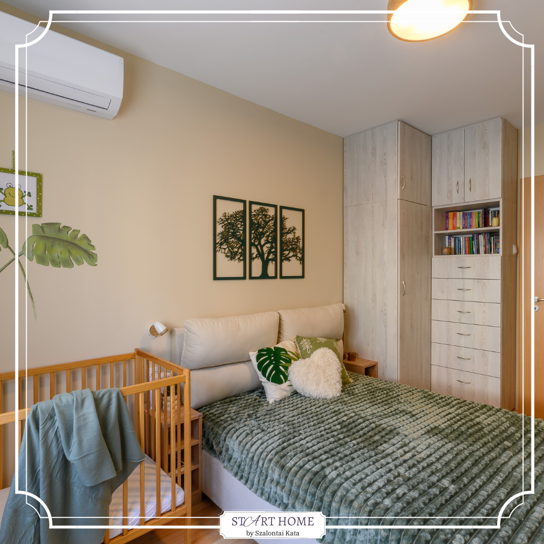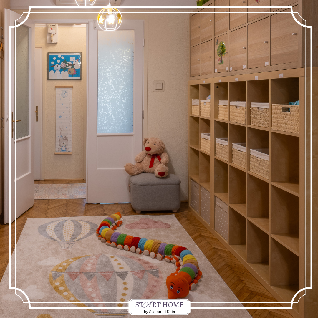 A budapesti lakás össz alapterülete mindössze 45 nm és itt el egy totyogó és egy sokszor home office-ban dolgozó édesapa, anyuka és egy cicus.