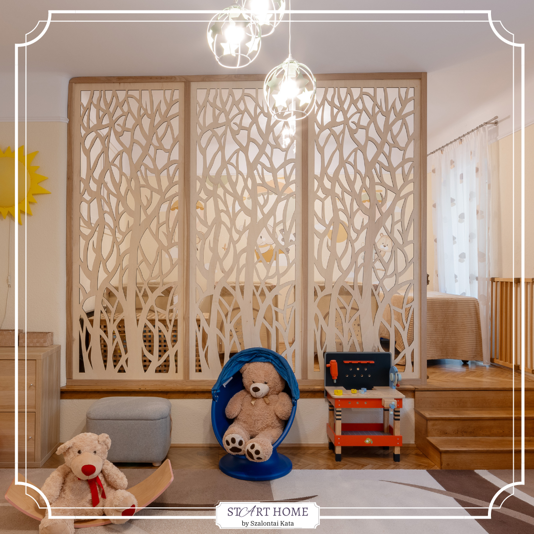 A kis alvókuckót a játéktértől KKlaser által készített, egyedileg tervezett, hatalmas méretű 3D-s fa térelválasztópanel választja el.