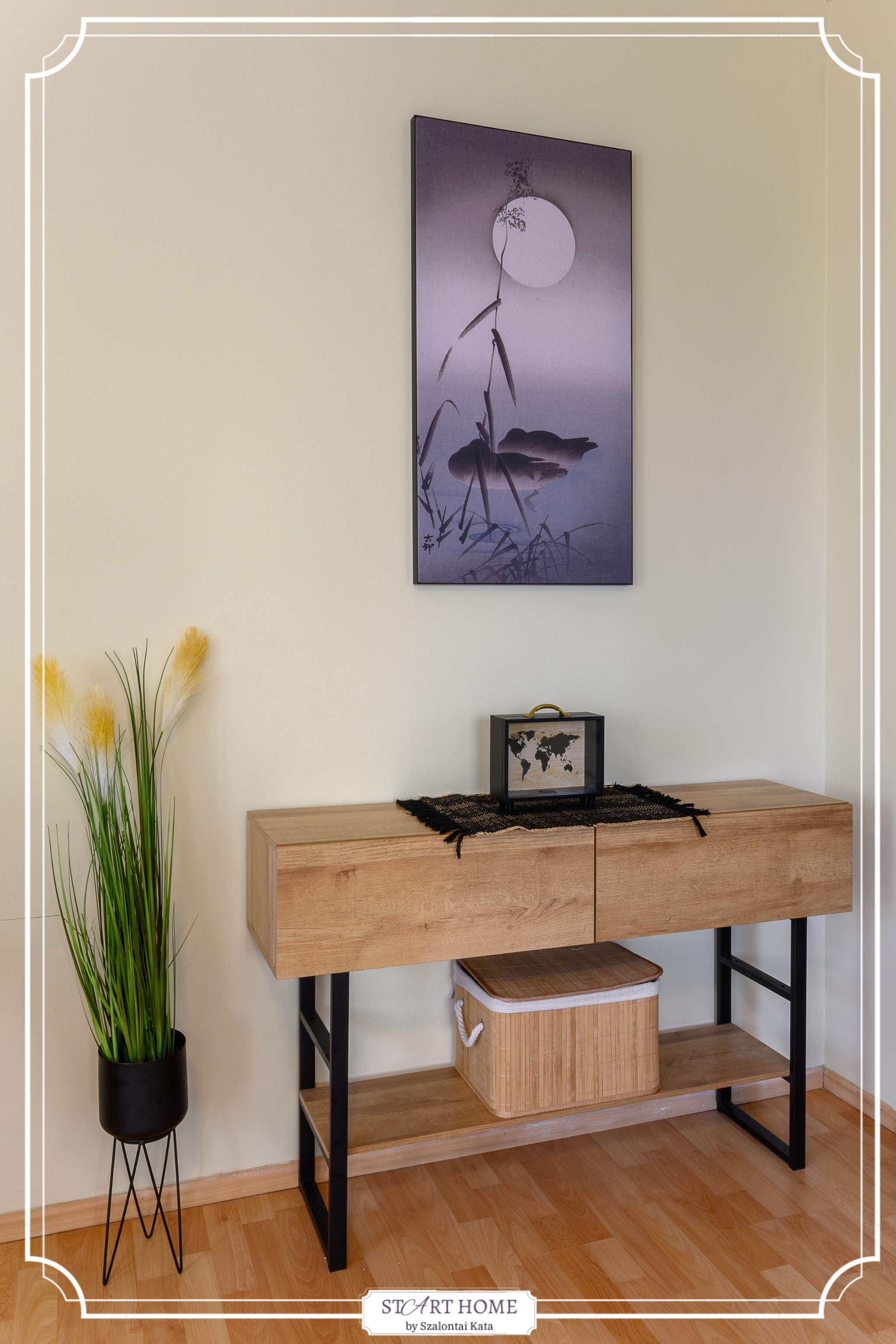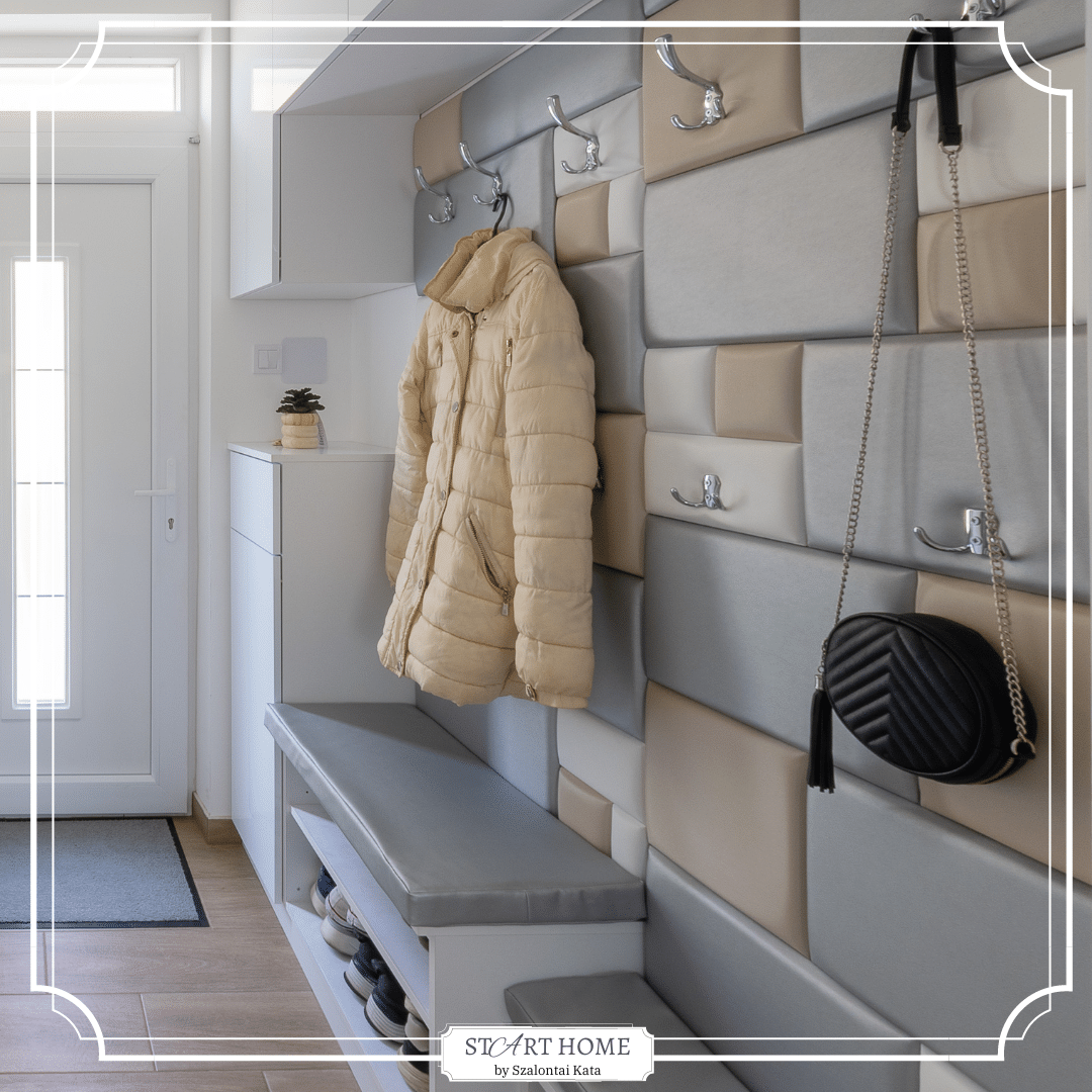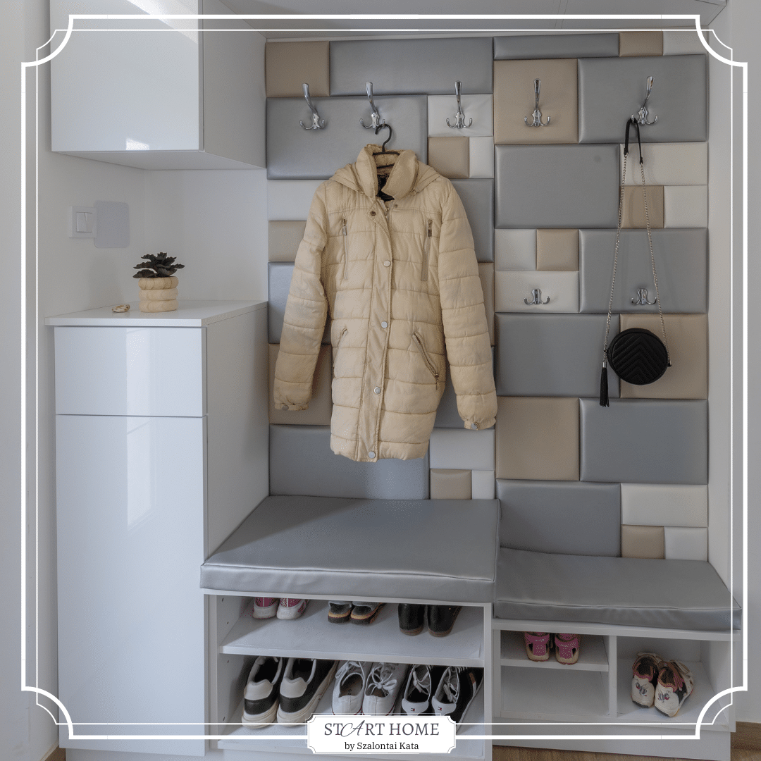 Az előszoba helyiséget teljesen újragondoltuk: egy új gipszkartonfallal kialakítottunk egy modern, letisztult előszobát. A mindent elnyelő és praktikusan kialakított előszobabútor tervét is minden centimétert figyelembe én készítettem.