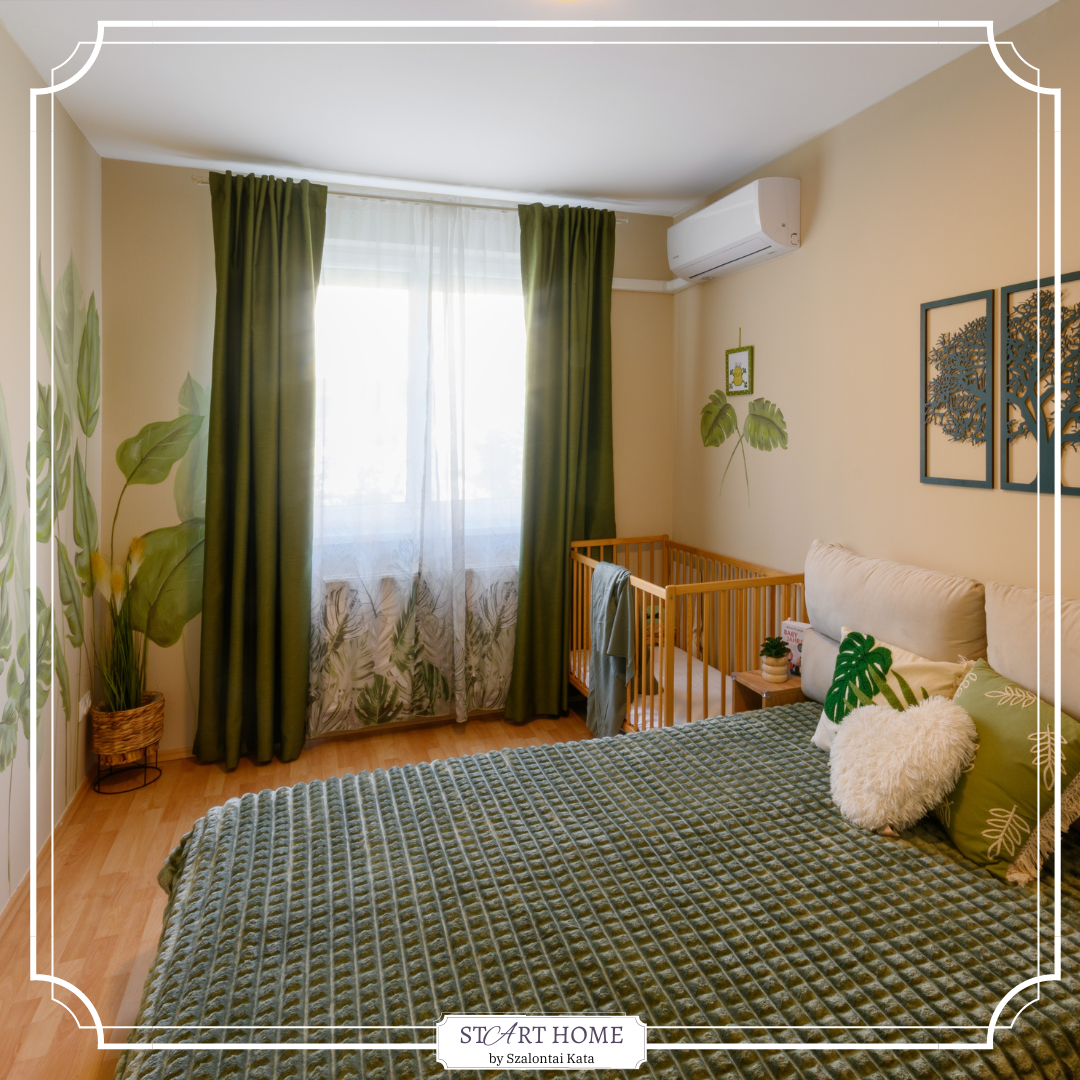 A hálószoba szineinek az erdőzöld-bézs-barna kombinációt választottuk, míg a nappaliban adott volt egy szürkés-menta színű kanapé, így ehhez, valamint pár fekete kiegészítőhöz – például egy fantasztikus fekete gitárhoz álmodtuk meg a budapesti nappali színvilágát.