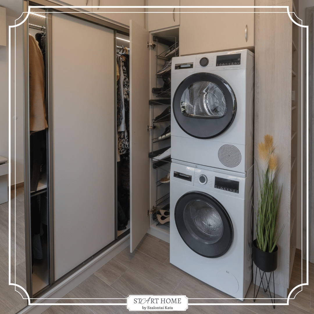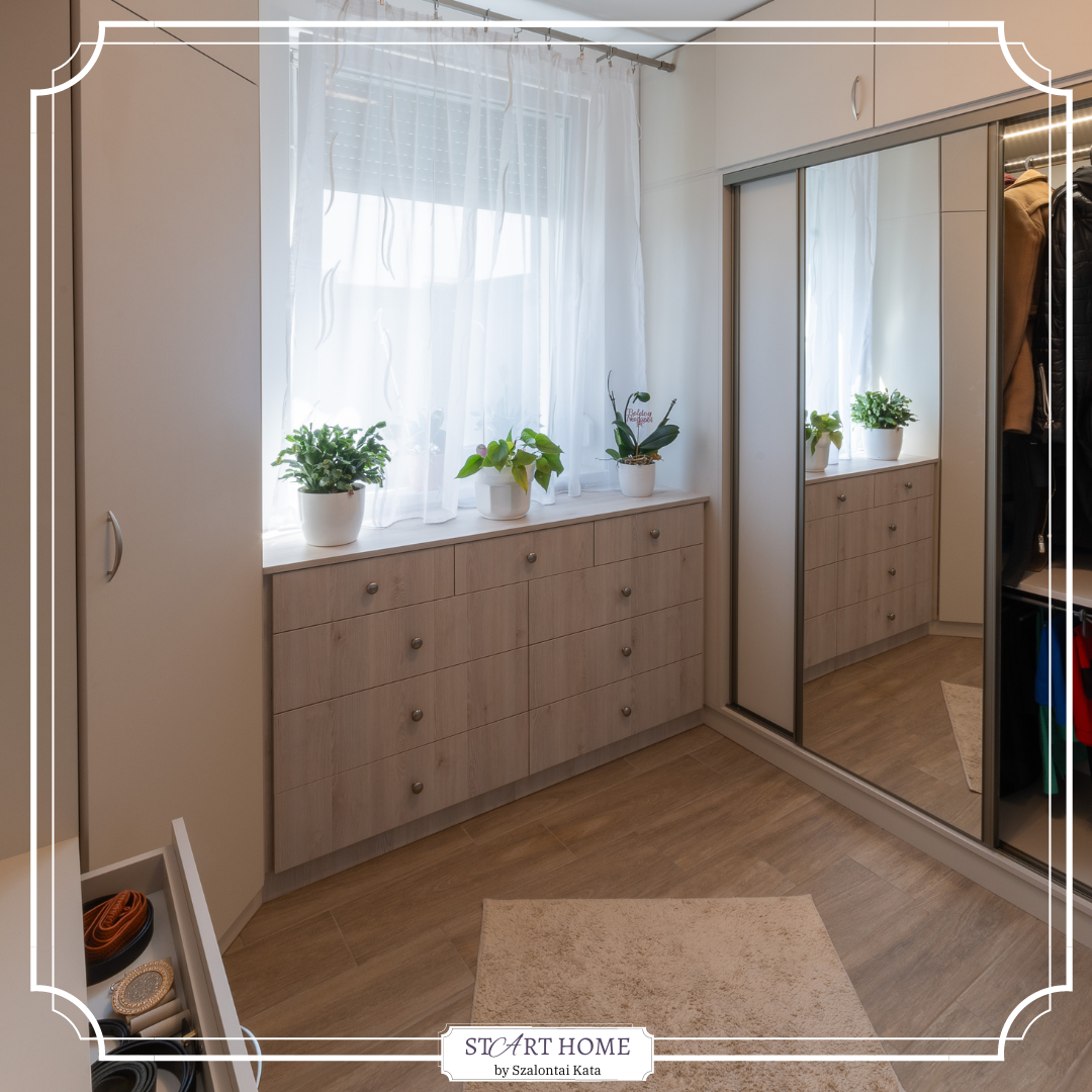 A gardróbszoba minden négyzetcentiméterét praktikusan kihasználtuk úgy, hogy végül a bútor jól használható és csinos legyen, ugyanakkor arányai, méretei a szobához passzoljanak.