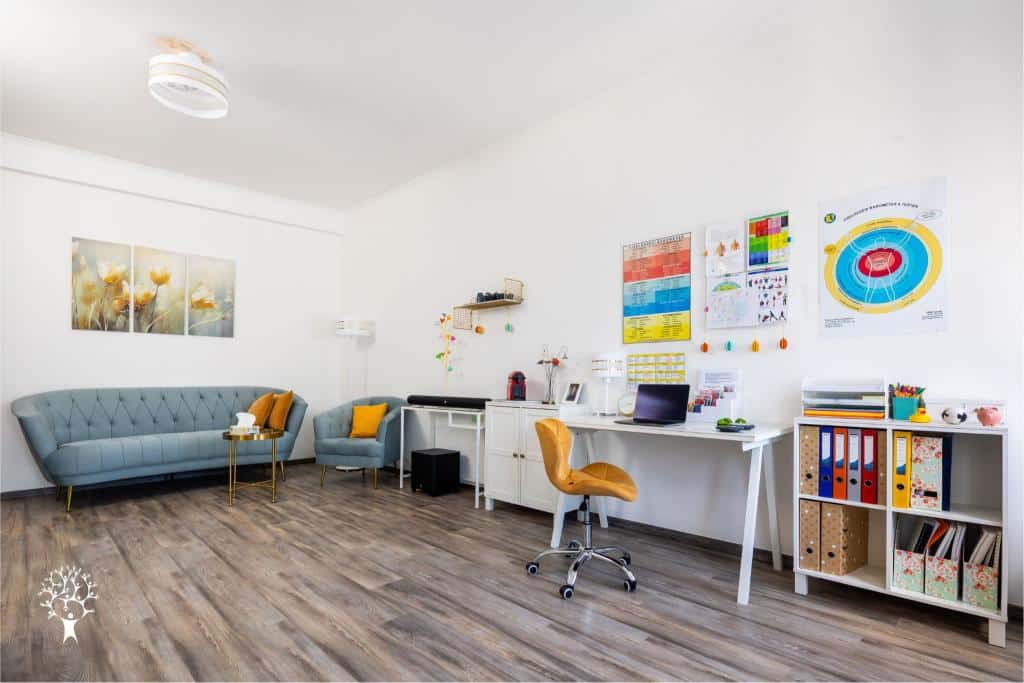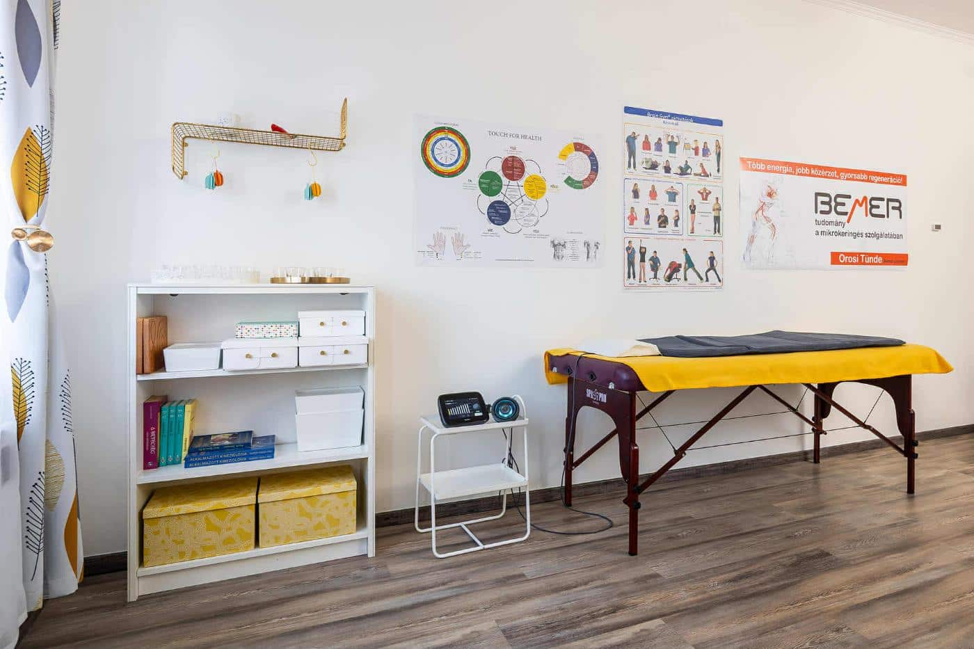 Ahogyan múltkor is, most is több szempontot figyelembe véve, az előírásnak megfelelően alakítottam ki a helyiséget, monst már az előbbinél nagyobb rutinnal. A tervezés során a legfőbb cél az volt, hogy a hely szolgálja az ide érkező páciensek lazulását,gyógyulását, és egyszerre munkaterülete a kezelő terapeutának. A tér ezúttal is könnyen kezelhető, átalakítható.